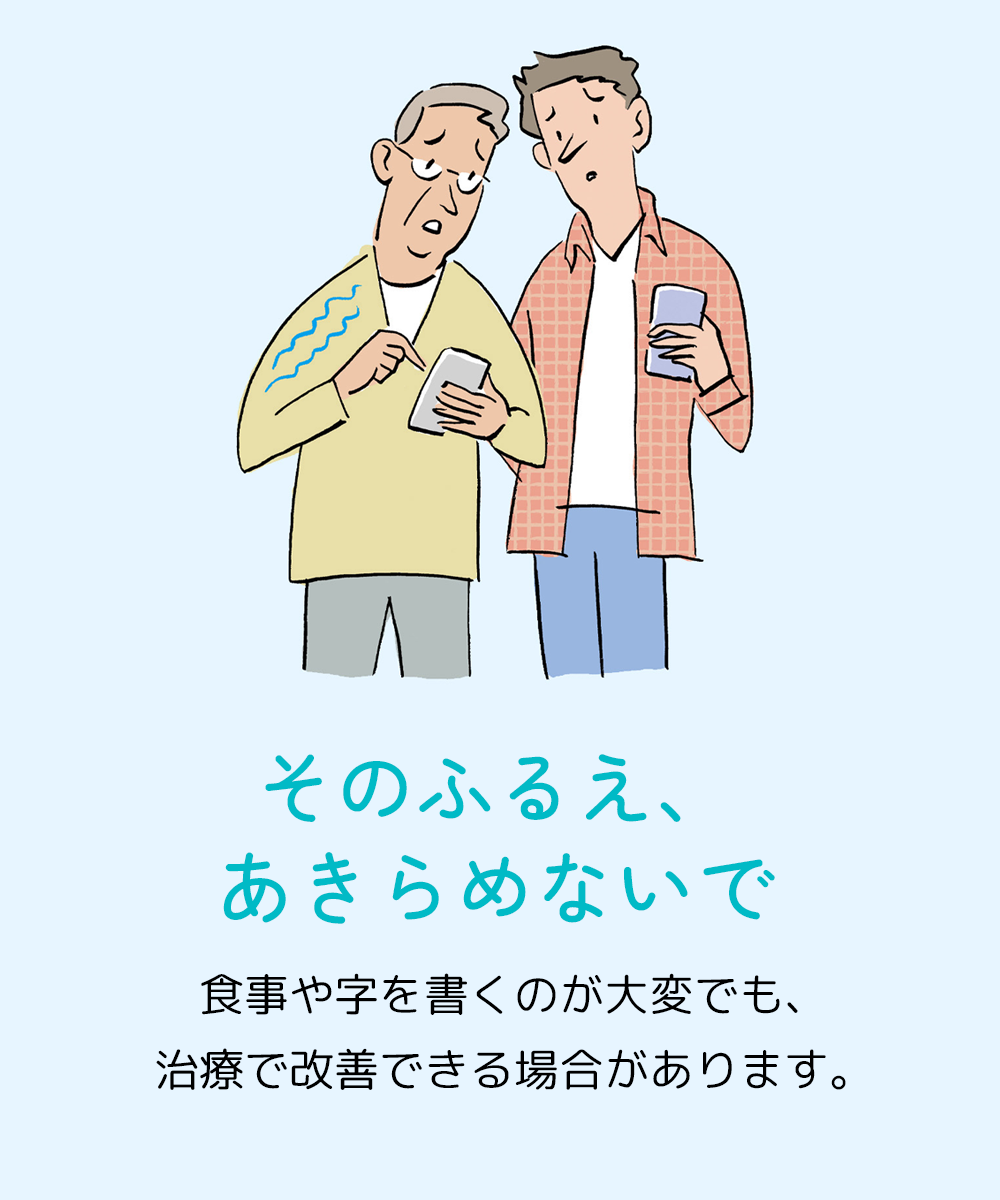 ふるえは医学的には振戦と呼ばれ、身体の一部が自分の意志とは関係なく規則的に動いてしまう状態を指します。本サイトでは、本態性振戦とパーキンソン病についてご説明します。